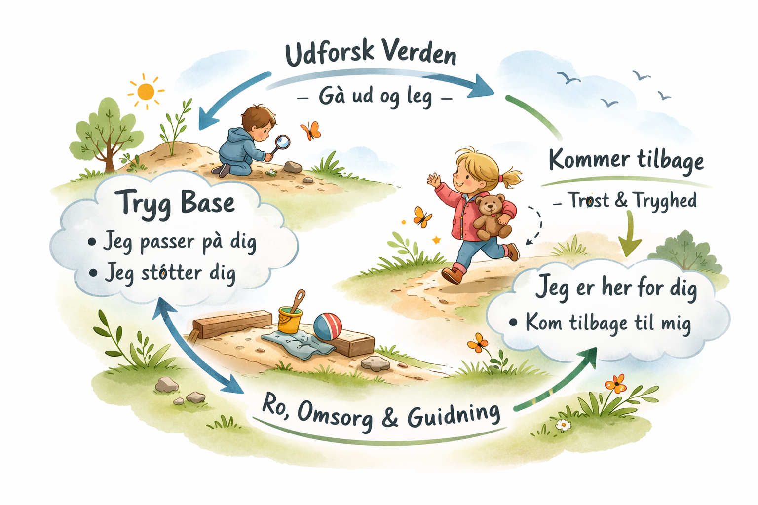 Vi arbejder med COS (Circle of Security), som hjælper os med at forstå og støtte børns behov for både nærhed og udforskning. I praksis betyder det, at det pædagogiske personale er tydelige og trygge baser, som børnene kan gå ud fra og komme tilbage til. Vi øver os i at se bag barnets adfærd og møde barnet med ro, omsorg og guidning, så barnet oplever sig forstået og støttet.